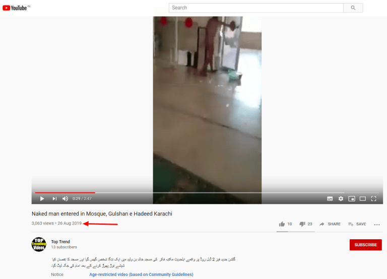 With a keyword search on YouTube, Alt News found an extended video of the same incident posted on August 26, 2019. From 21 seconds onward in the video below, one can see the same visuals viral on social media. The video is titled, “Naked man entered in Mosque, Gulshan e Hadeed Karachi.”