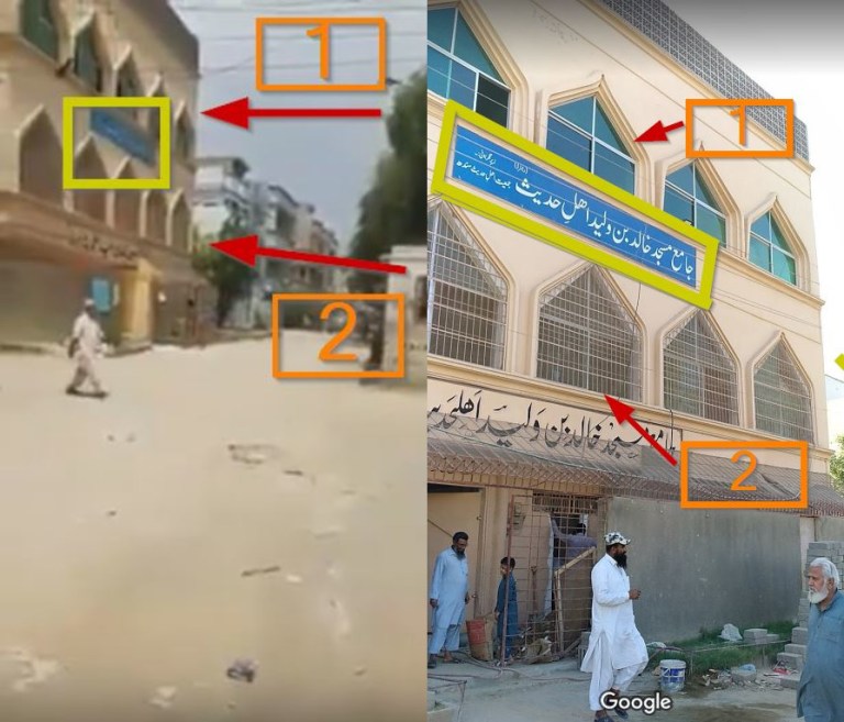 According to the clip’s description, the video is from Pakistan’s Karachi and the incident took place at a mosque in “Gulshan e Hadeed”. We looked up several mosques on Google maps located in this area and found that the said incident took place at Jamia Masjid Khalid Bin Waleed. In the comparison posted below, we have matched a frame from the video with an image of the mosque available on Google. The matching similarities are as follows: