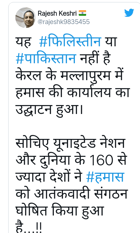 Twitter user @ByRakeshSimha claimed that the rally supported Hamas which is designated as a terror group by the United Nations, US and many European countries. (Archive link)