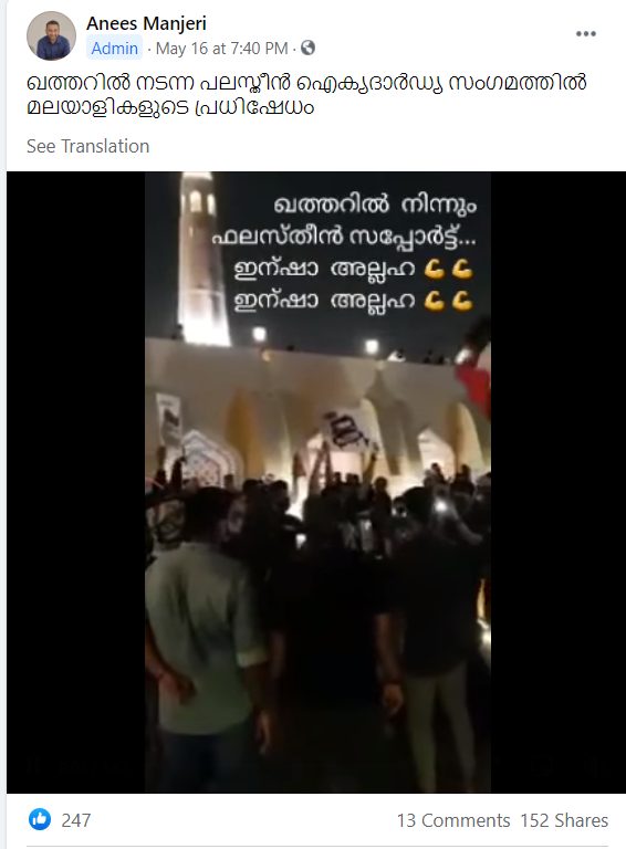 People in the video are raising slogans in Malayalam. We performed a keyword search on Facebook taking this as a clue and came across a Facebook post by one Anees Manjeri who shared the same clip on May 16. He wrote in Malayalam that Malayalis in Qatar participated in a local rally held in support of Palestine.