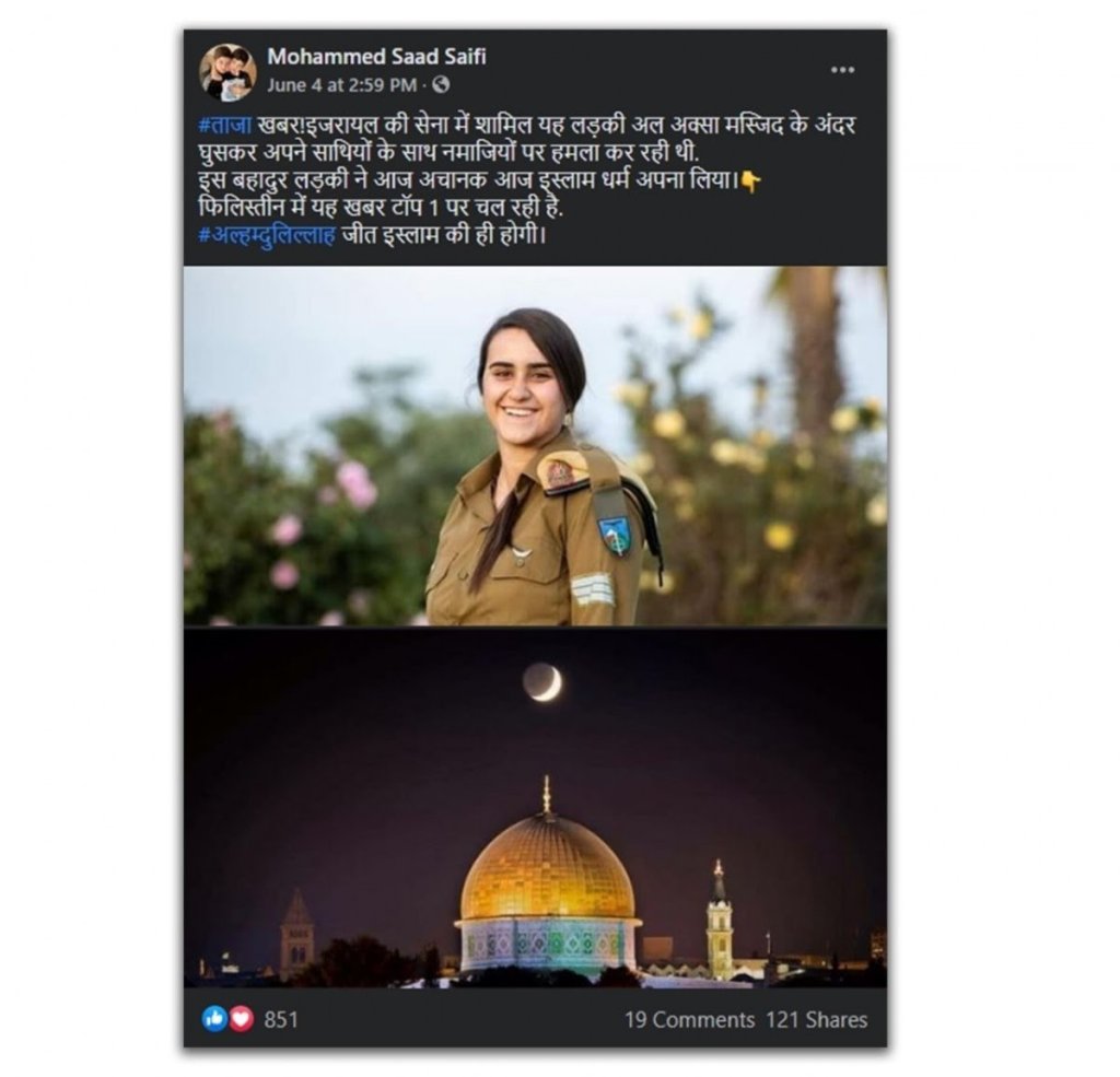 This picture of an Israeli soldier was shared with the fake claim that she had converted to Islam after the Al-Aqsa mosque incident