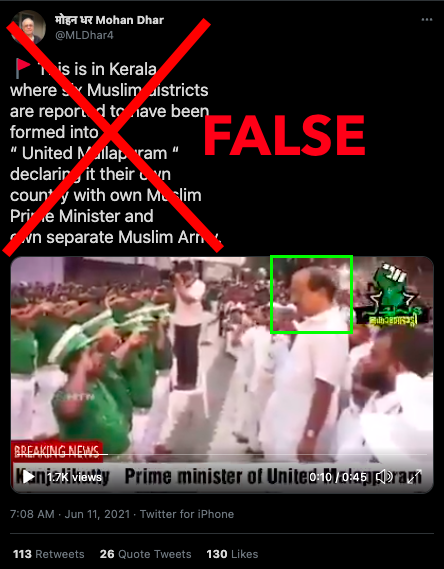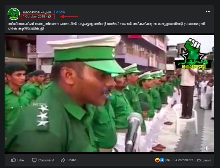 In 2018, Facebook page ‘കൊണ്ടോട്ടി പച്ചപട‘ (Kondotty Green Army) posted the viral video along with a similar claim in Malayalam – “PK Kunhalikutty, Prime Minister of Malappuram receiving the Guard of Honor of the Green Army at the Seethi Sahib Memorial Parade”. Kondotty is a town in Malappuram.