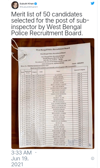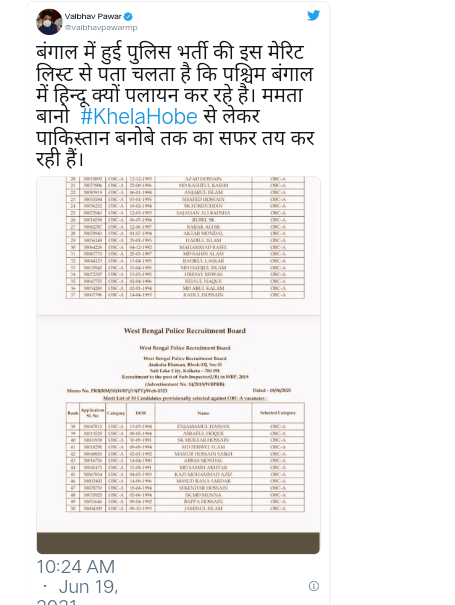 The West Bengal Police Recruitment Board (WBPRB) announced the final result of the 2019 Recruitment to the post of Sub-Inspector (Armed Branch and Unarmed Branch) Exam on June 18, 2021. Bharatiya Janata Yuva Morcha (BJYM) Madhya Pradesh state president Vaibhav Pawar tweeted a list of 50 selected candidates. A majority of the candidates on the list are Muslims. “Mamata Banerjee is ensuring (West Bengal) transforms into Pakistan,” he wrote.