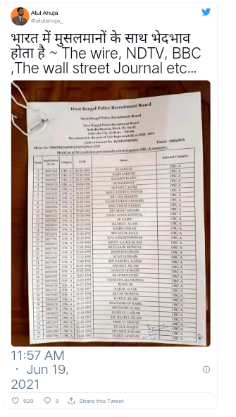 The list widespread on social media is the list of candidates provisionally selected against OBC (Other Backward Classe)-A vacancies. The website of the West Bengal Police Recruitment Board (WBPRB) has two lists for each vacancy (10 lists in total). One of the lists with a majority of Muslim names has been cherry-picked to falsely portray that WBPRB has only selected Muslim candidates. The lists of provincially selected candidates against SC reservation has 147 names (1 and 2) and the lists against ST reservation has 40 names (1 and 2). It is noteworthy that Muslims are not eligible for SC and ST reservations. Furthermore, there are 366 provincially selected candidates against the UR (Unreserved) category (1 and 2) and a majority of them are Hindus.